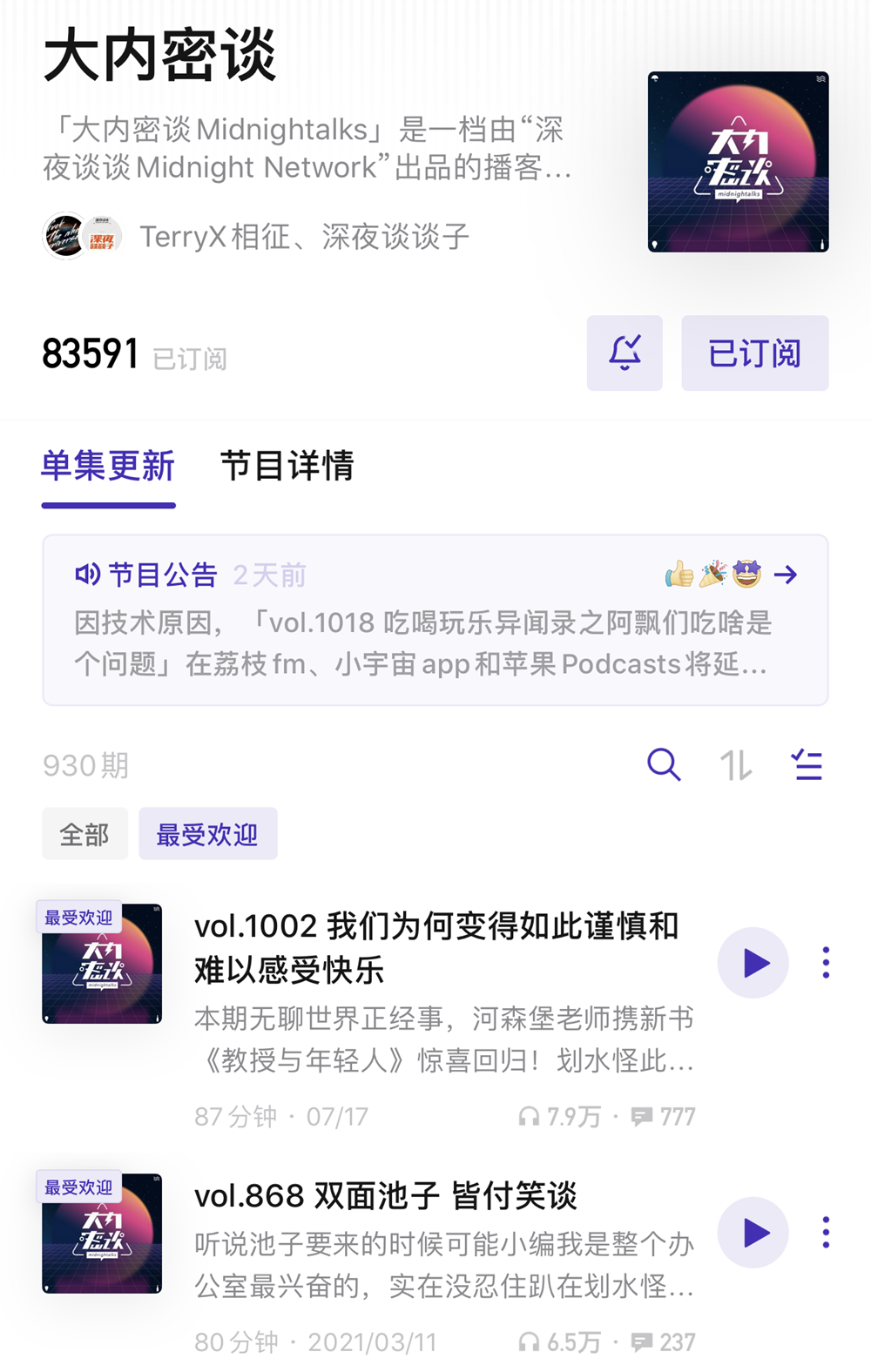 《大內(nèi)密談》在2013年末榮獲當年蘋果年度最佳新播客獎,2017年正式成為一個商業(yè)項目,2018年拿到了ONES Ventures數(shù)百萬元天使投資,直到今年的7月10日第1000期上線,收聽量已經(jīng)到了400萬。