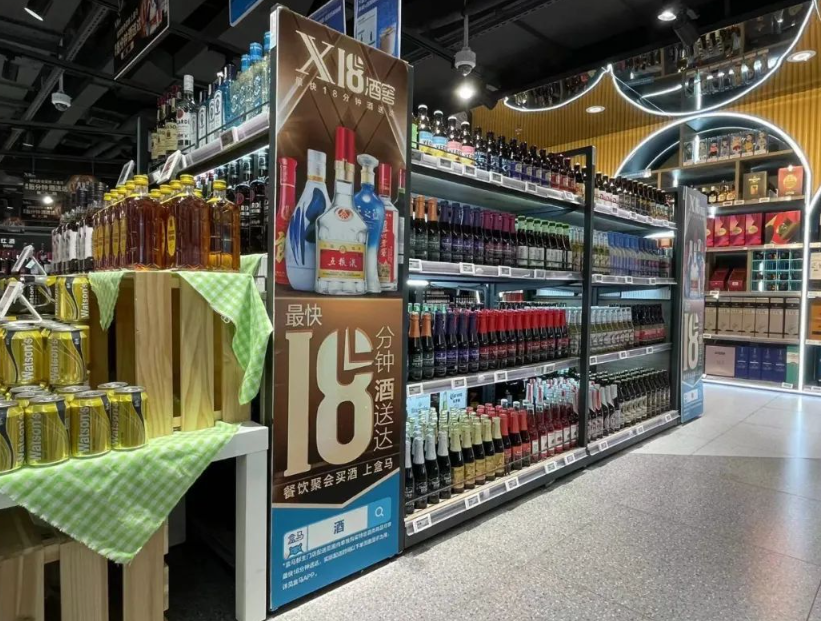 另一邊,一些互聯(lián)網(wǎng)大廠旗下的新零售超市也在“酒生意”上花心思。2021年9月,阿里旗下的盒馬生鮮推出酒業(yè)項(xiàng)目“X18酒窖”,即盒馬酒水能在18分鐘內(nèi)配送完成,這比酒類新零售頭號玩家壹玖壹玖還要快一分鐘。