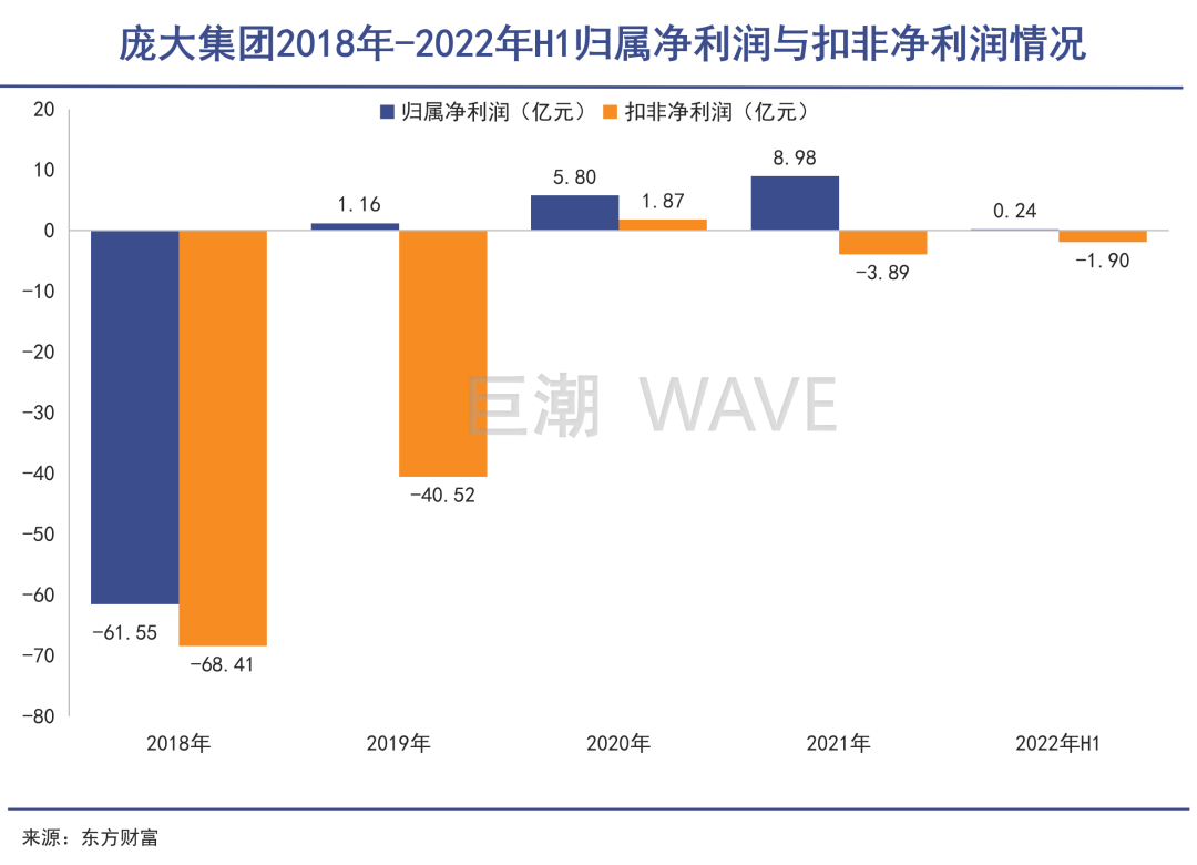 自從2012年開始,龐大集團(tuán)在A股的十年內(nèi),僅有一年扣非凈利潤(rùn)為正數(shù),其他年份均為負(fù)數(shù)。尤其是在2018年,龐大集團(tuán)扣非凈利潤(rùn)巨虧68億。