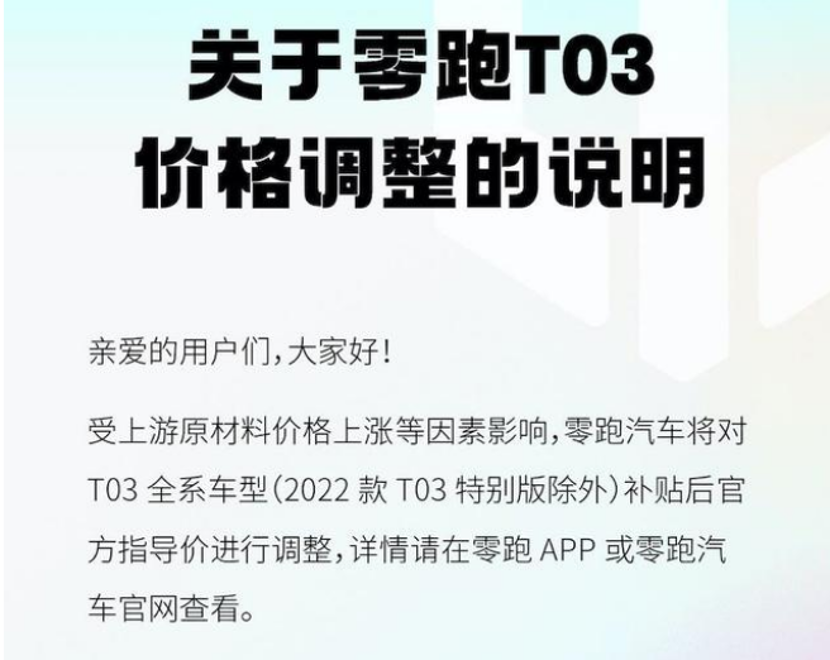 7月31日,由于鋰電池等原材料價格的持續(xù)上漲,零跑已經(jīng)對T03車型全系進行了價格上調(diào),補貼后售價從之前的7.39萬元到8.99萬元,漲價為7.95萬元到9.65萬元。調(diào)整后的價格已經(jīng)于2022年8月1日零時正式生效。