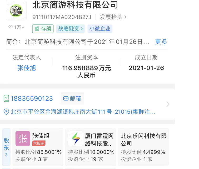 《羊了個羊》的開發(fā)商北京簡游科技有限公司,是一家成立于2021年的年輕公司,由張佳旭、廈門雷霆網(wǎng)絡(luò)科技股份有限公司、北京樂閃科技有限公司共同持股,注冊資本116萬,參保人數(shù)7人,是貨真價實的小微企業(yè)。