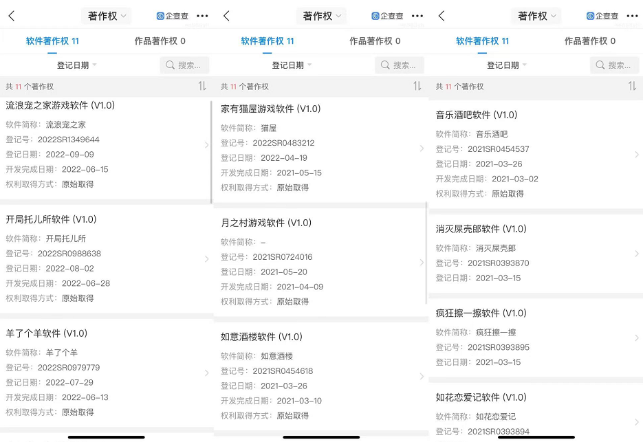 但即便成功了兩次,小微游戲仍然比中重度游戲更缺乏規(guī)律可循。知識產(chǎn)權(quán)信息顯示,簡游科技公司十余項游戲軟件著作權(quán)已獲得登記批準(zhǔn),其中包括《解救大西瓜》《瘋狂擦一擦》等,但真正出圈的只有《羊了個羊》。