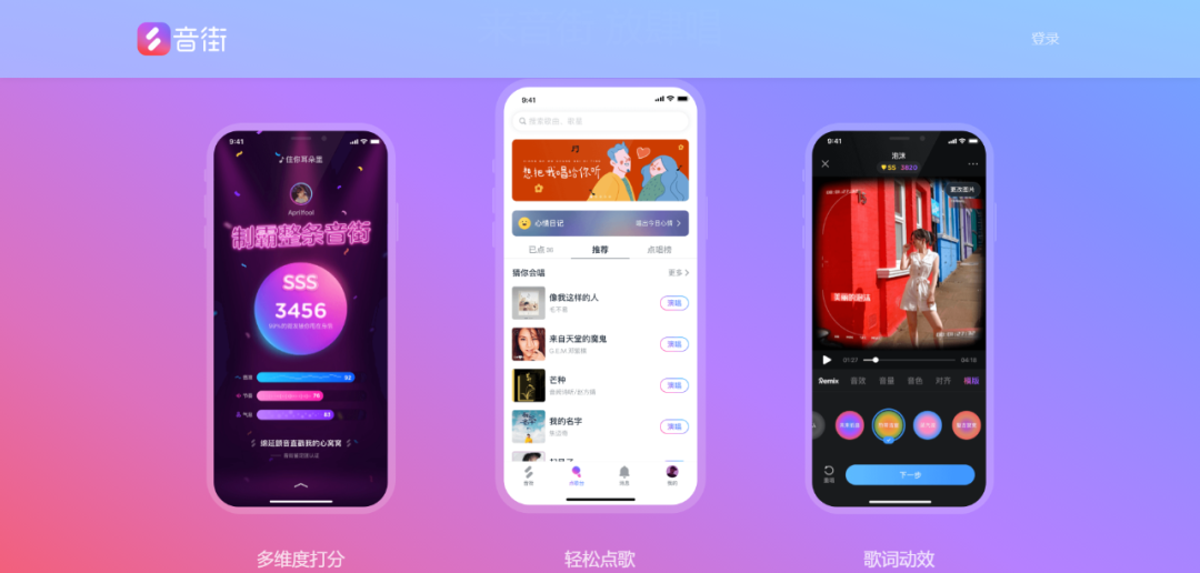 2020年6月16日,網(wǎng)易云發(fā)布了專為年輕人打造的獨立K歌APP音街。這一特點也在產(chǎn)品設計上得以體現(xiàn):音街主打輕松點唱、優(yōu)質(zhì)推薦、歌詞動效、多維度打分、片段短唱等。和其他K歌APP不同的是,音街打開后的默認界面并非點唱,而是推薦其他用戶的演唱歌曲,致力于結識音樂好友,在某種意義上它更強調(diào)內(nèi)容和社區(qū),而非K歌的工具屬性。