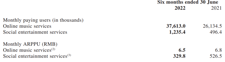 根據(jù)2022年中期財報顯示,截至6月30日,網(wǎng)易云音樂社交娛樂服務月付費用戶數(shù)為123.5萬,同比增幅達149%。社交娛樂服務模塊每月每付費用戶收入從526.5元跌至329.8元。