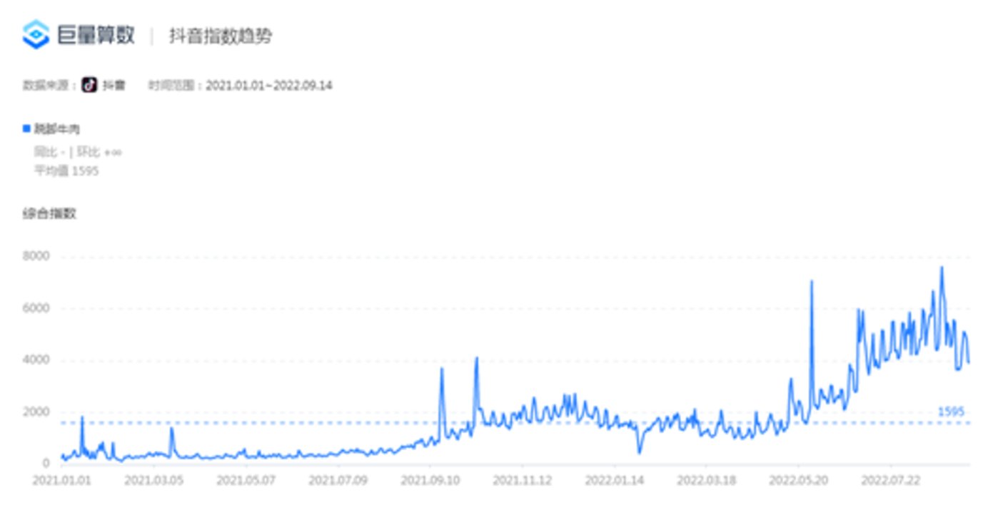 蹺腳牛肉的逆勢(shì)增長肉眼可見。巨量算數(shù)顯示,從去年夏天開始,蹺腳牛肉的抖音綜合指數(shù)快速上升,今年五月之后再創(chuàng)新高。而在小紅書上,關(guān)于“蹺腳牛肉”的筆記也有4萬+篇。
