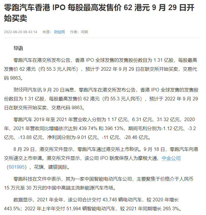 成立于2015的零跑,單純從銷量上來(lái)看,已經(jīng)連續(xù)兩個(gè)月超過(guò)“蔚小理”這些一線新勢(shì)力了。公司今年8月順利通過(guò)港交所聆訊,9月20日正式招股,不可謂不快。