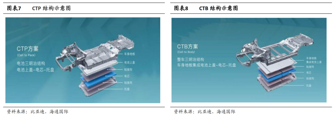 而CTC則是電芯直接集成于車輛底盤的工藝,目前采取CTC工藝的車型分別為特斯拉22年版Model3/Y和零跑的C01,只是在CTC還沒(méi)有完全落地的時(shí)候,比亞迪就推出了CTB(Cell To Body)技術(shù)——一種電池車身一體化的新型電芯集成方式。