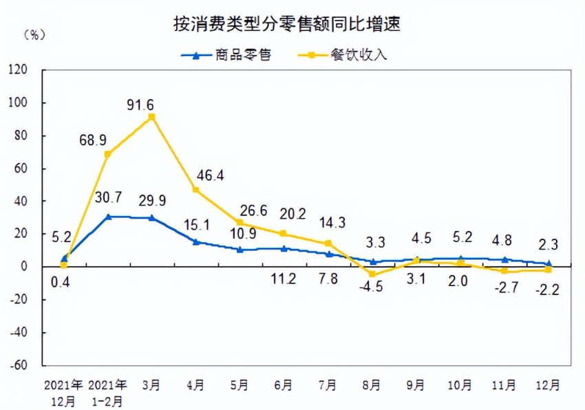 2021年,疫情緩和。消費(fèi)數(shù)據(jù)也開始復(fù)蘇。還是來自國家統(tǒng)計局的數(shù)據(jù)顯示,2021年商品零售393928億元,比上年增長11.8%;餐飲收入46895億元,增長18.6%。
