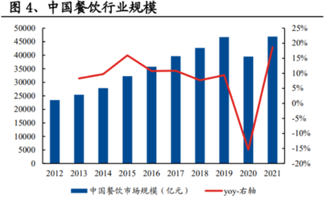 國家統(tǒng)計局?jǐn)?shù)據(jù)顯示,2021年我國餐飲業(yè)規(guī)模為4.96萬億元。根據(jù)中國飯店業(yè)協(xié)會數(shù)據(jù),2019 年原料進(jìn)貨成本平均占餐飲業(yè)營收的41.87%,假設(shè)占比不變,則2021年餐飲業(yè)原材料市場為1.96萬億元。