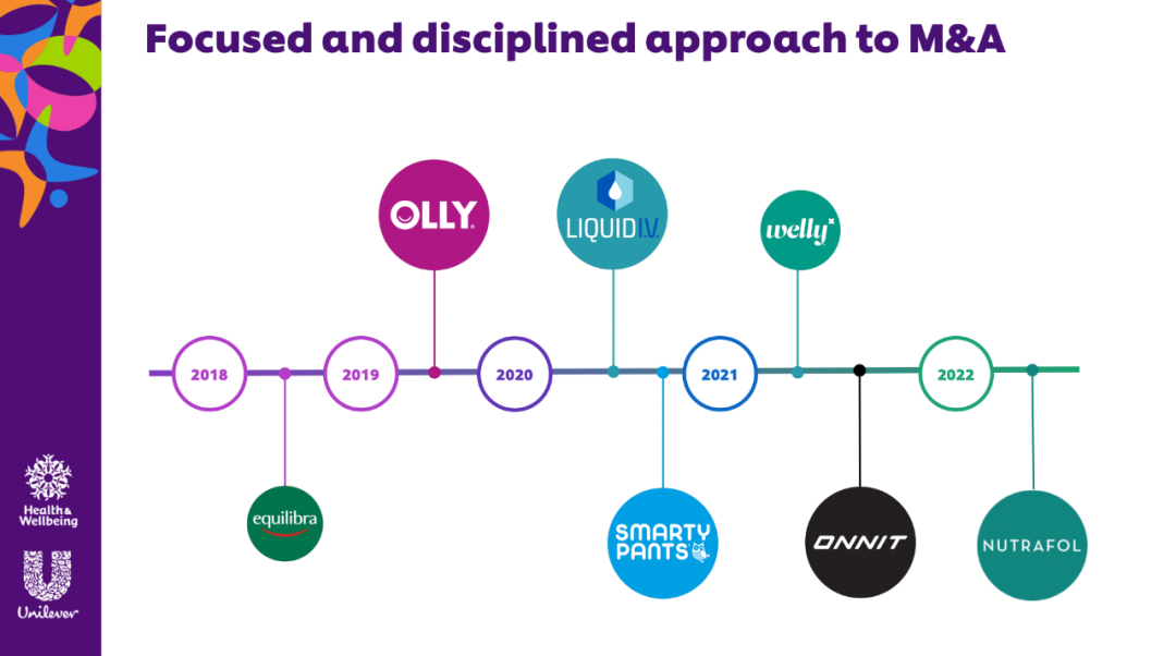 對此,喬安路回應稱,這一比例數(shù)字是對的,自2017年以來,聯(lián)合利華約有160億歐元用于收購,90%集中在兩個領域,即對高端美容品類的補強收購和對功能性營養(yǎng)保健品的補強收購。