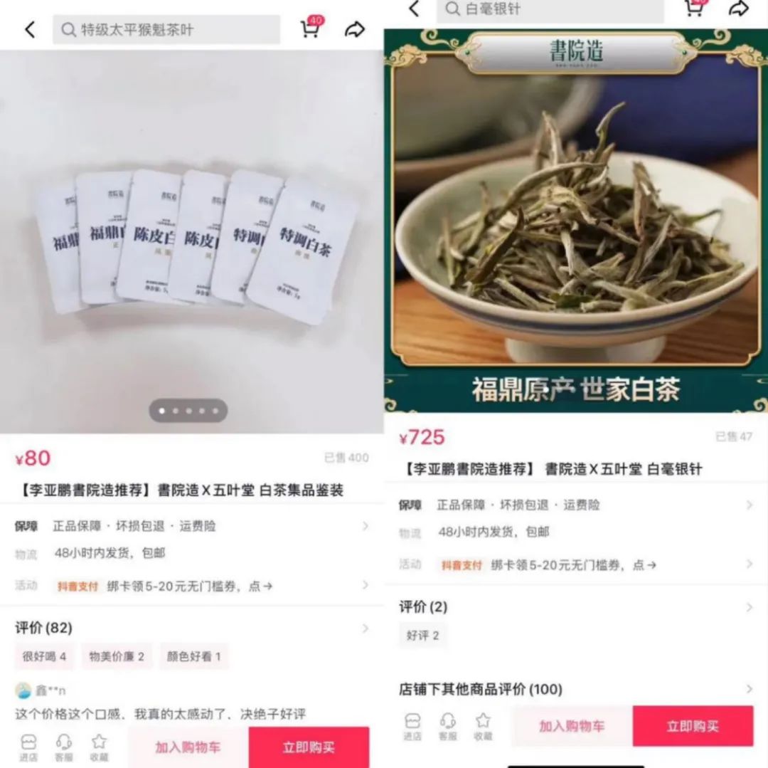 在書院造的抖音店鋪里可以看到,6小袋凈含量30克的白茶售價(jià)80元,已售出400單。從福鼎白茶到陳皮白茶,還有特調(diào)白茶,價(jià)格不盡相同,便宜的特調(diào)白茶120克售價(jià)319元,貴一點(diǎn)的白毫銀針60克售價(jià)725元,已經(jīng)售出47單。