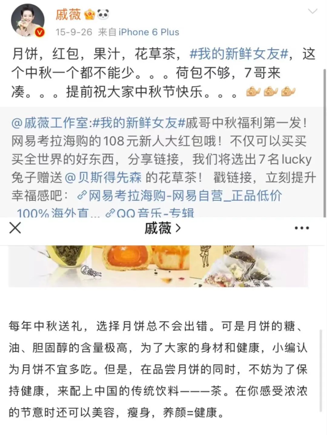 不久前帶貨翻車的戚薇,也曾在2015年推銷過自己的茶葉。戚薇聯(lián)合自己代言的品牌Freshmix,推出了“戚薇茶包”花草茶,在當(dāng)時(shí),這款花草茶還打著追求“白瘦美”的旗號,推出了八個款式。