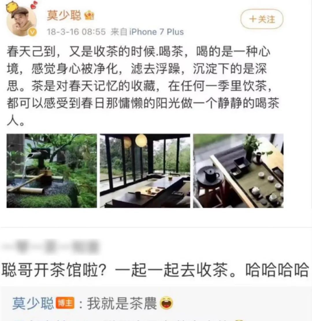 賣茶葉的老牌明星不止李菁菁,比如退圈后的演員莫少聰,不光賣茶葉,還在云南擁有自己的茶園,自稱茶農(nóng),平常微博就會分享一些和茶以及禪意相關(guān)的內(nèi)容。