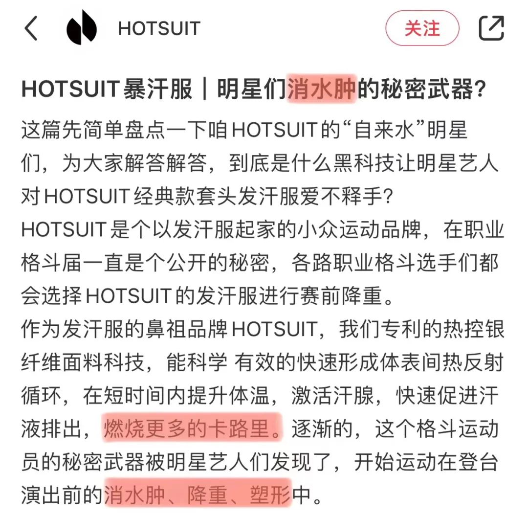 為了避免曇花一現(xiàn)的命運(yùn),以HOTSUIT為代表的暴汗服品牌,正在試圖摘掉暴汗服身上的偽科學(xué)、智商稅標(biāo)簽,對(duì)相關(guān)爭(zhēng)議一一回?fù)簟?/p>