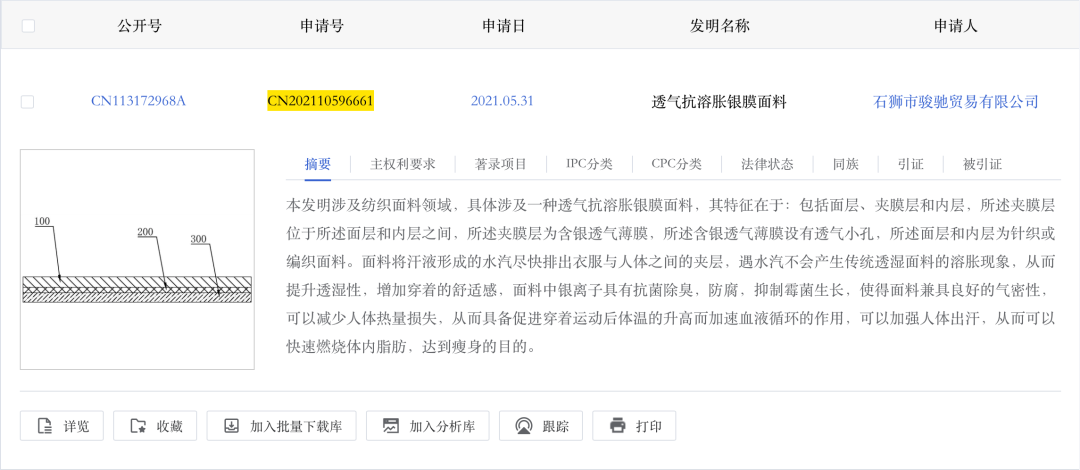 「新熵」查閱國(guó)家知識(shí)產(chǎn)權(quán)局官網(wǎng)信息發(fā)現(xiàn),石獅市駿馳貿(mào)易有限公司(HOTSUIT主體公司,現(xiàn)改名為石獅市駿馳科技有限公司)擁有一項(xiàng)名為“抗溶脹銀膜面料”的發(fā)明專利,該面料的夾膜層為設(shè)有透氣小孔的含銀透氣薄膜,能夠提升透濕性,增加穿著的舒適感。
