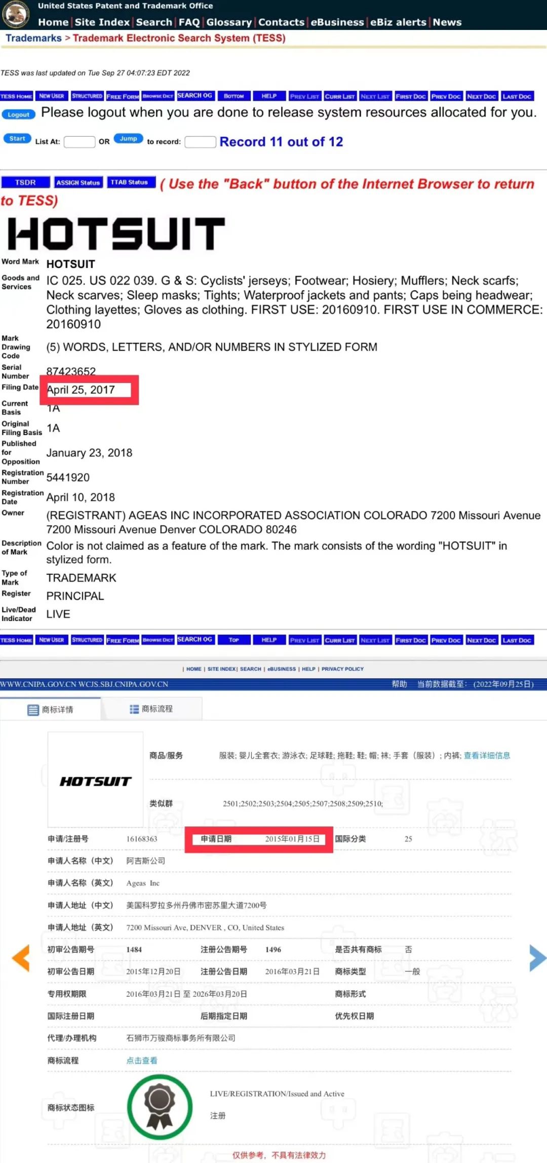 HOTSUIT在美國(guó)申請(qǐng)商標(biāo)的時(shí)間晚于中國(guó)