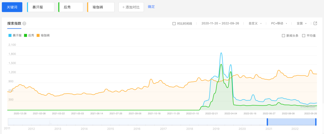 百度指數(shù)顯示,2022年1月初,“暴汗服”和“后秀”的搜索指數(shù)迅速飆升,但至3月末,兩者的搜索指數(shù)就開(kāi)始斷崖式下跌,目前呈緩慢下跌趨勢(shì)。與此形成鮮明對(duì)比的是,“瑜伽褲”一直維持著不錯(cuò)的熱度。