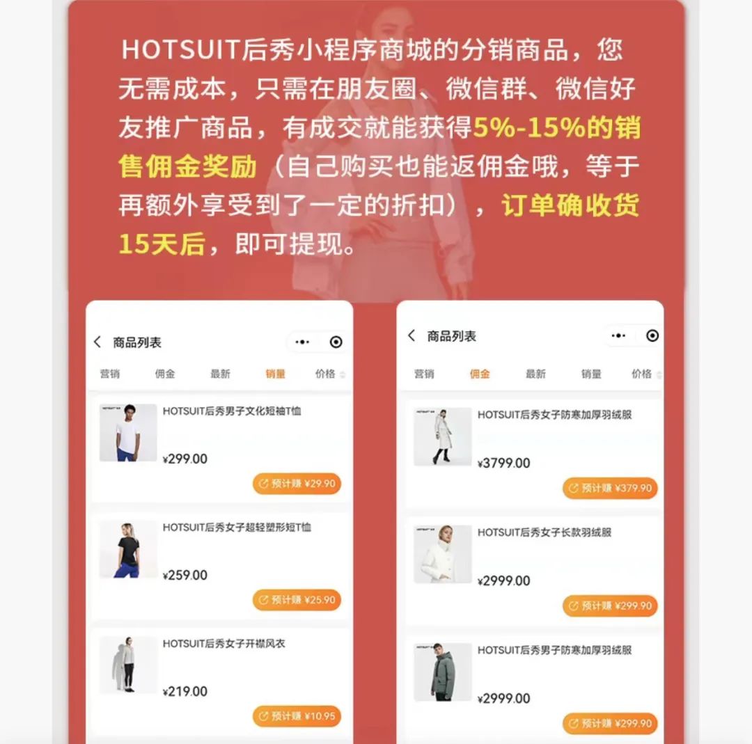 面對(duì)品牌頹勢(shì),HOTSUIT試圖通過(guò)微商模式帶動(dòng)消費(fèi)者裂變,即招募品牌分享官,讓其通過(guò)微信朋友圈、微信群、微信好友等渠道內(nèi)推廣商品,有成交就能獲得5%-15%的銷售傭金獎(jiǎng)勵(lì)。但不是所有的品牌都像拼多多一樣,能夠在微信生態(tài)內(nèi)獲得快速的用戶裂變。299-3799元的商品價(jià)格區(qū)間,實(shí)在不具備下沉基礎(chǔ)。