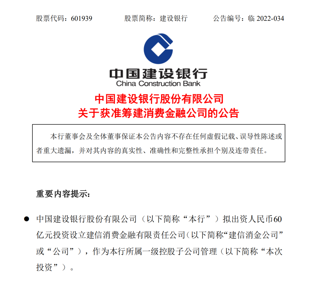 2019年6月20日,建設(shè)銀行董事會就審議通過了《關(guān)于設(shè)立消費金融子公司的議案》,同意該行出資不超過60億元,與其他出資人共同出資設(shè)立消費金融公司。