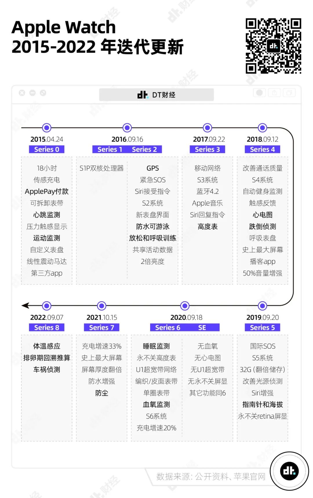 2015年,第一款發(fā)售的series 0,雖然能測心率、連Wi-Fi,但在功能上更多地依附于手機。在隨后幾年內(nèi),才增加了獨立GPS、游泳防水、呼吸訓練、心電圖、血氧測量、睡眠記錄、體溫感應等運動和健康監(jiān)測功能,并逐漸獨立于手機。