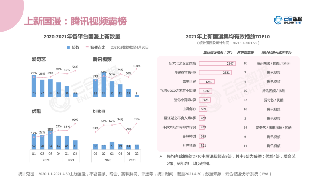 根據(jù)云合數(shù)據(jù)的《2021年動畫網(wǎng)播市場觀察》,當(dāng)年前4個月愛奇藝、騰訊視頻有效播放市占率達(dá)74%;細(xì)分領(lǐng)域來看,騰訊視頻國漫市場占有率最高,上新國漫集均有效播放TOP10中6部為騰訊視頻獨(dú)播。