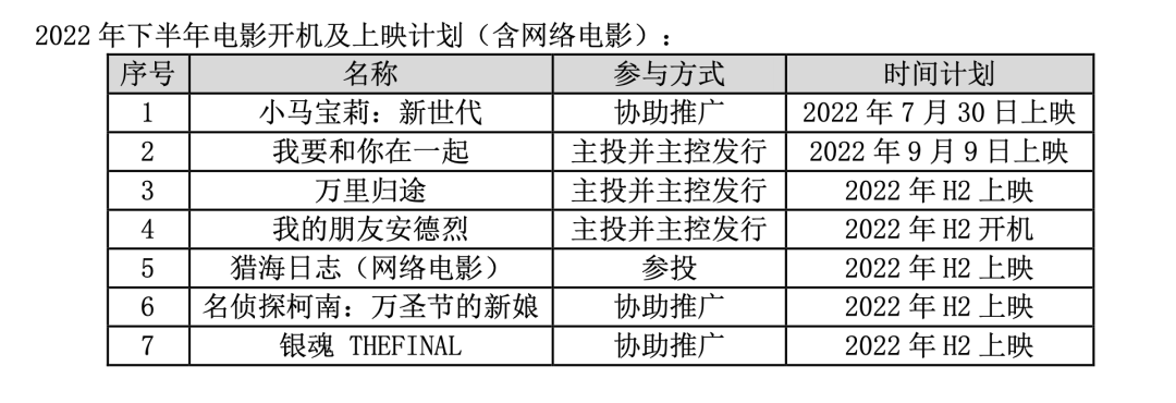 另外,報(bào)告期內(nèi)公司有兩部電影《尋秦記》《燃冬》已進(jìn)入后期制作,在豆瓣上標(biāo)注暫定上映時(shí)間為2022,但均未在公司財(cái)報(bào)披露的上映計(jì)劃中。