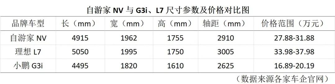 從車身尺寸數(shù)據(jù)上來(lái)看,自游家NV的車身尺寸參數(shù)與L7較為接近,與G3i相比自游家NV在內(nèi)部空間的表現(xiàn)更好;而該車價(jià)格則是在G3i與L7二者之間,能夠接受此價(jià)格的消費(fèi)在數(shù)量相對(duì)于L7會(huì)更多一些。