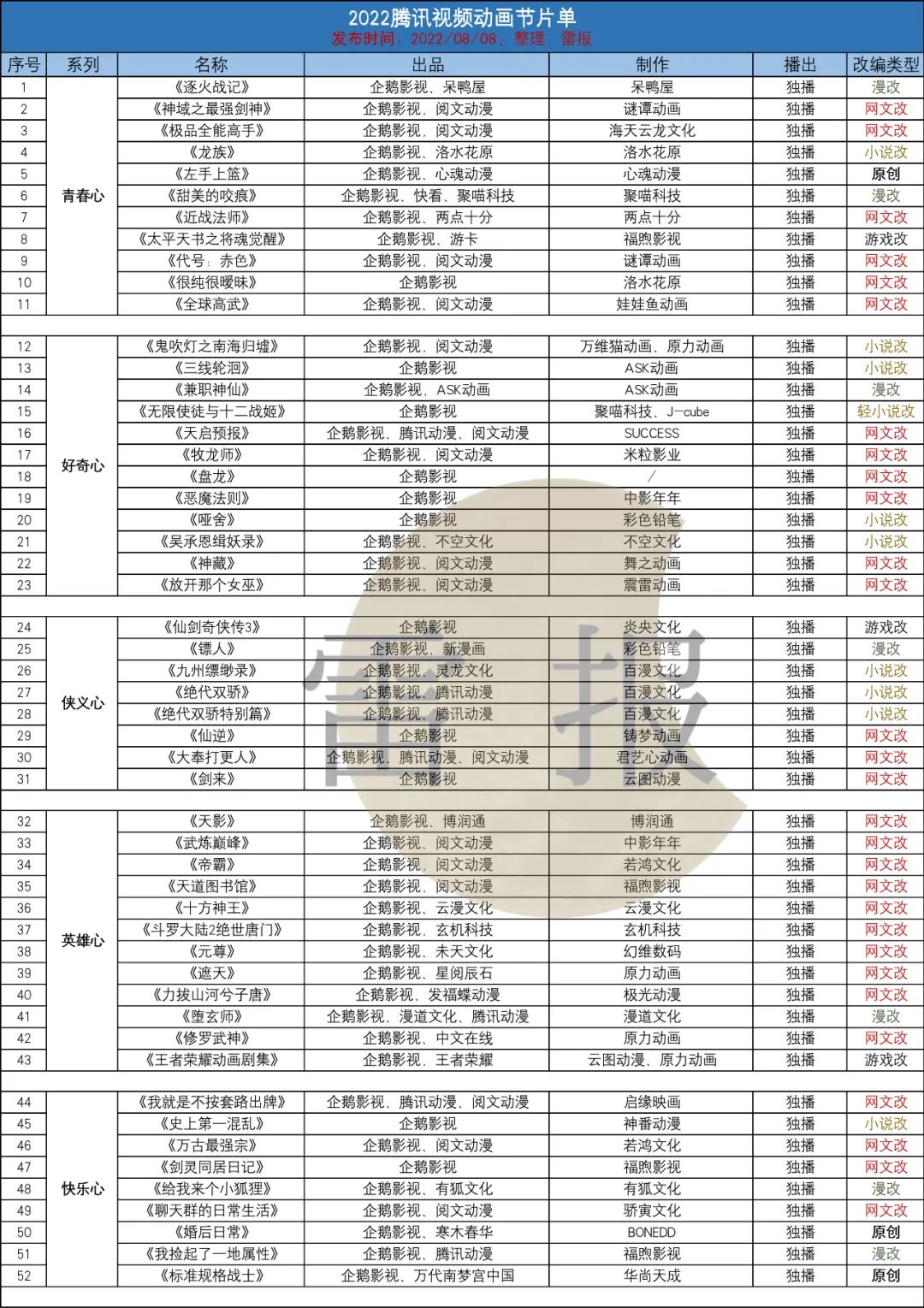 先來(lái)看騰訊,這是其8月8日發(fā)布的100部動(dòng)漫作品的詳細(xì)情況。