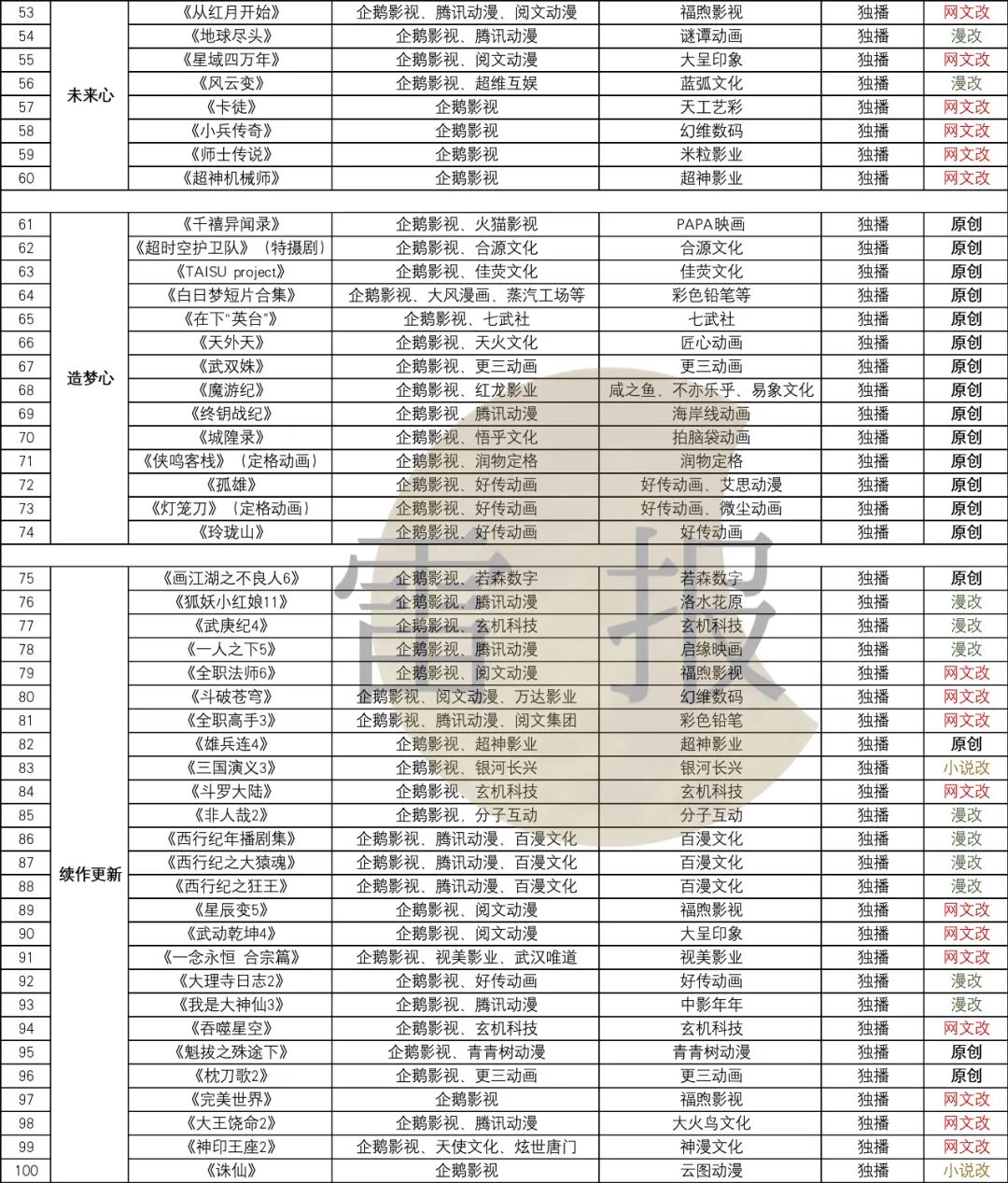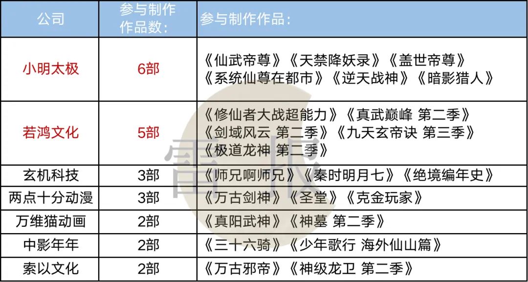 超神影業(yè)、ASK動(dòng)畫、聚喵科技、若鴻文化、米粒影業(yè)、啟緣映畫、大呈印象、更三動(dòng)畫等8家公司都參與制作了100部中的2部,其中有超神影業(yè)的《雄兵連4》,啟緣映畫的《一人之下5》,大呈印象的《武動(dòng)乾坤4》,更三動(dòng)畫的《枕刀歌2》。超神影業(yè)和更三動(dòng)畫均是騰訊投資公司。