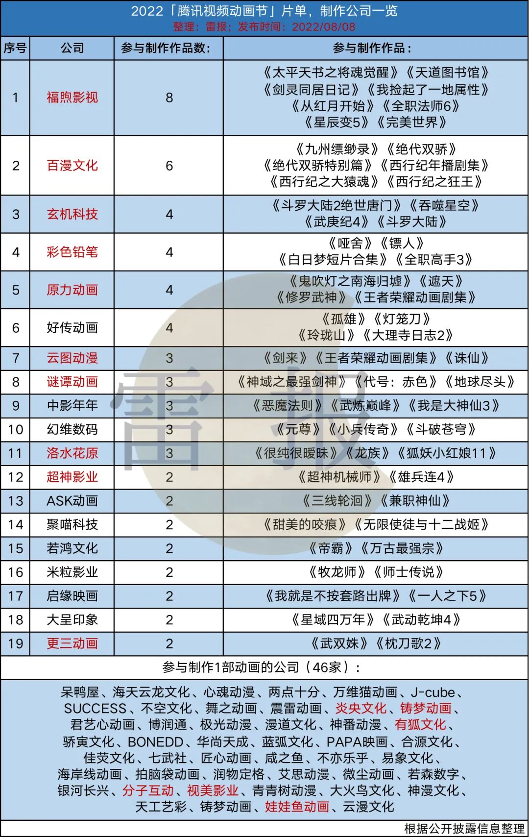 云圖動(dòng)漫、謎譚動(dòng)畫、中影年年、幻維數(shù)碼、洛水花原這5家公司,在該片單中均參與制作3部作品,中影年年有續(xù)作《我是大神仙3》,幻維數(shù)碼有年番《斗破蒼穹》,洛水花原負(fù)責(zé)制作《狐妖小紅娘11》。5家公司中有3家都曾獲得騰訊投資。