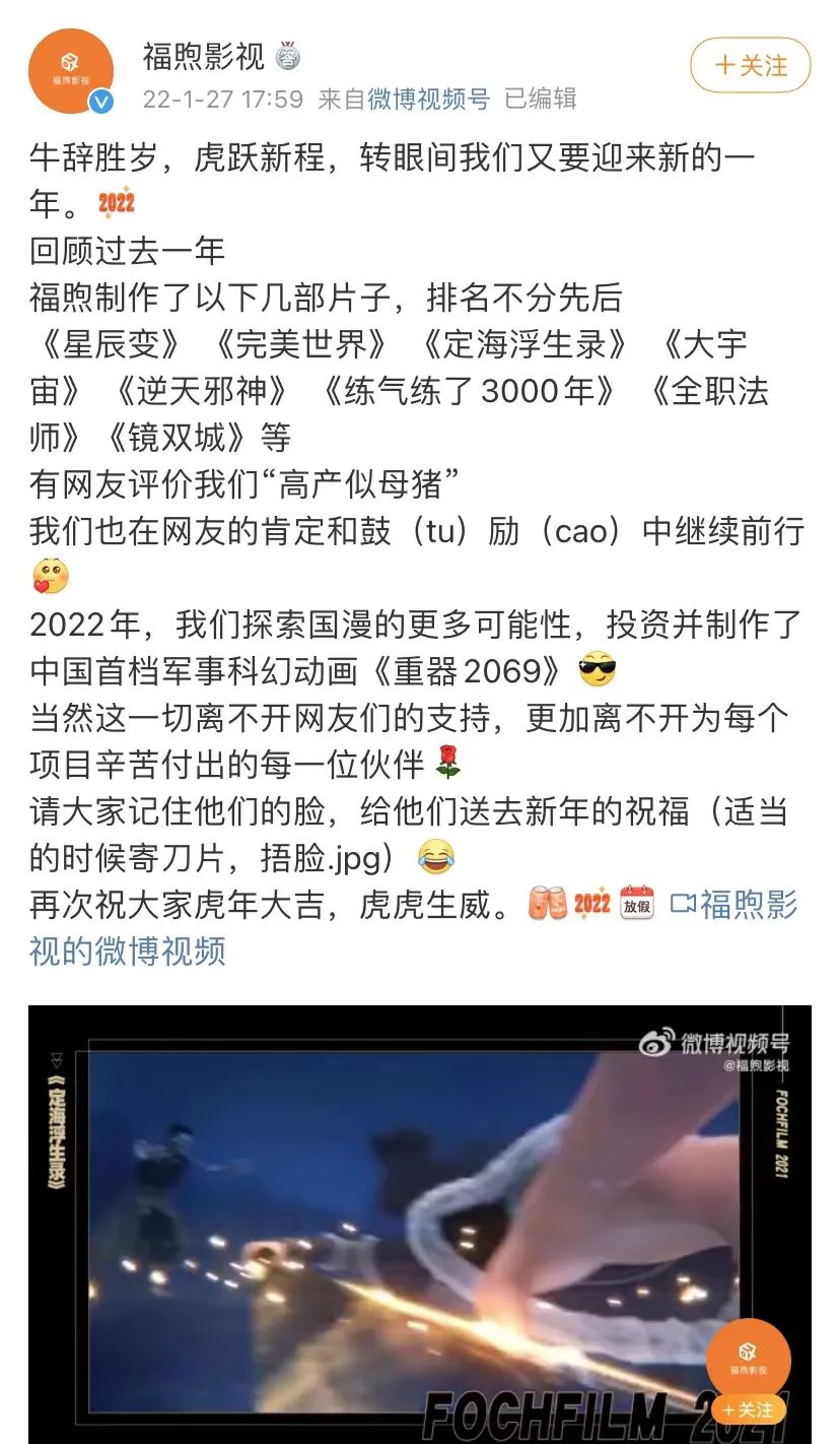福煦影視參與制作《太平天書之將魂覺醒》《天道圖書館》《劍靈同居日記》《我撿起了一地屬性》《從紅月開始》《全職法師6》《星辰變5》《完美世界》等8部作品,《全職法師6》《星辰變5》《完美世界》均是續(xù)作,《完美世界》還是年番。
