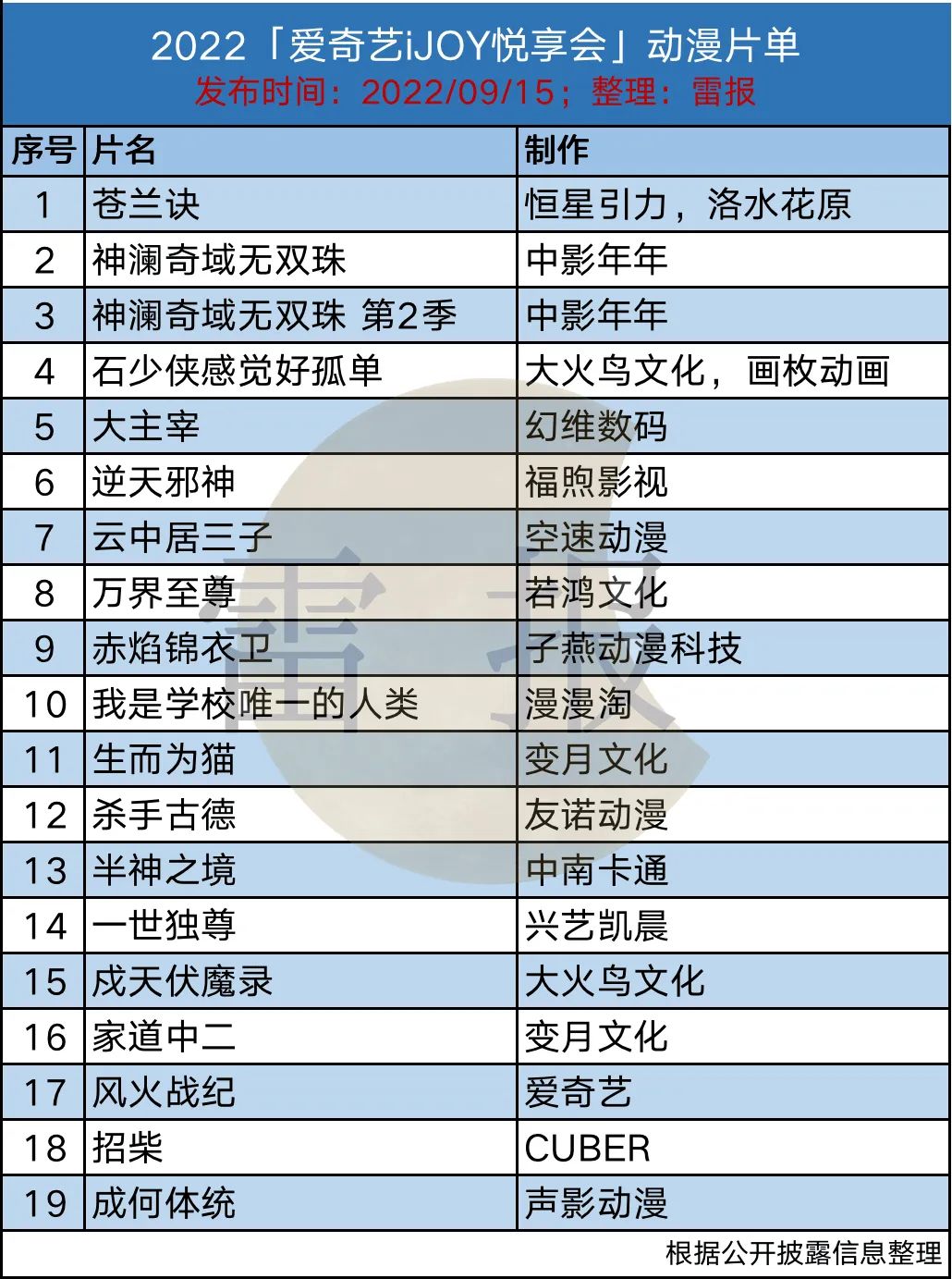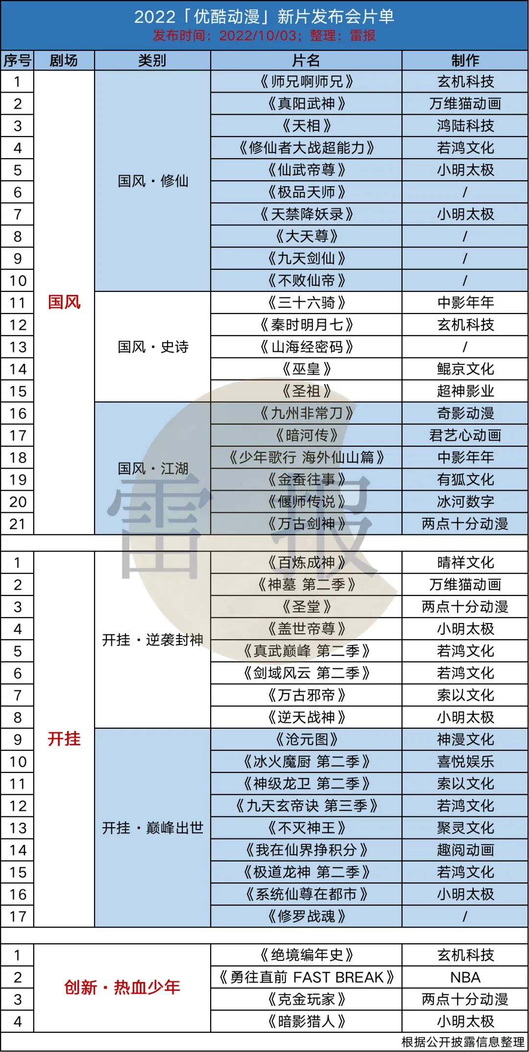 繼10月3日,優(yōu)酷舉辦2022年度動(dòng)漫發(fā)布會(huì),官宣42部作品后,除了B站之外,騰訊視頻、愛奇藝等國(guó)內(nèi)主要?jiǎng)赢嫴コ?、投資平臺(tái)都完成了今年發(fā)布重點(diǎn)動(dòng)漫片單的重大任務(wù)。