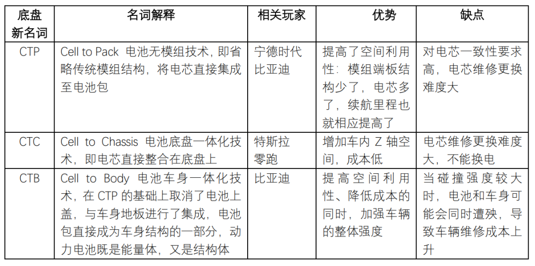 CTC、CTP、CTB……在這場(chǎng)變革中,越來(lái)越多的底盤(pán)新名詞涌現(xiàn)。我們先來(lái)了解一下,這些新名詞到底是什么?為了方便大家理解,筆者做了一個(gè)表格: