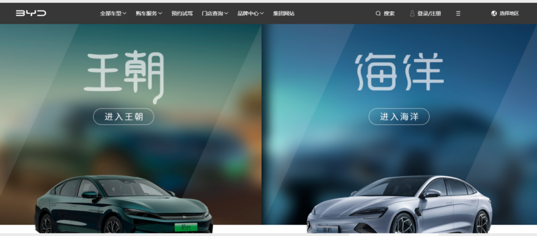 這從比亞迪的官網(wǎng)上可見一斑。大大的王朝、海洋字樣,從觀感上已經(jīng)遠(yuǎn)遠(yuǎn)超過了比亞迪本身的品牌字樣。