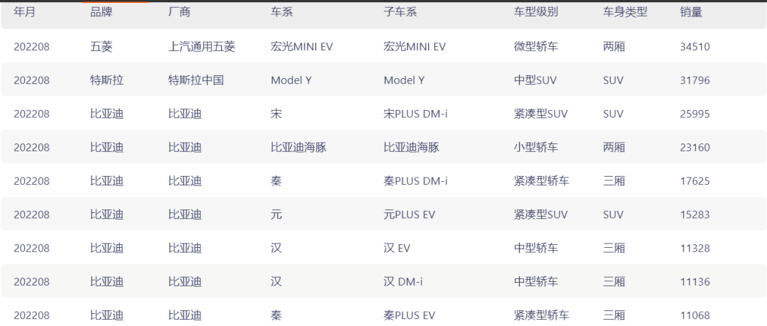 2022年8月新能源車型的銷量,來源:大搜車研究院
