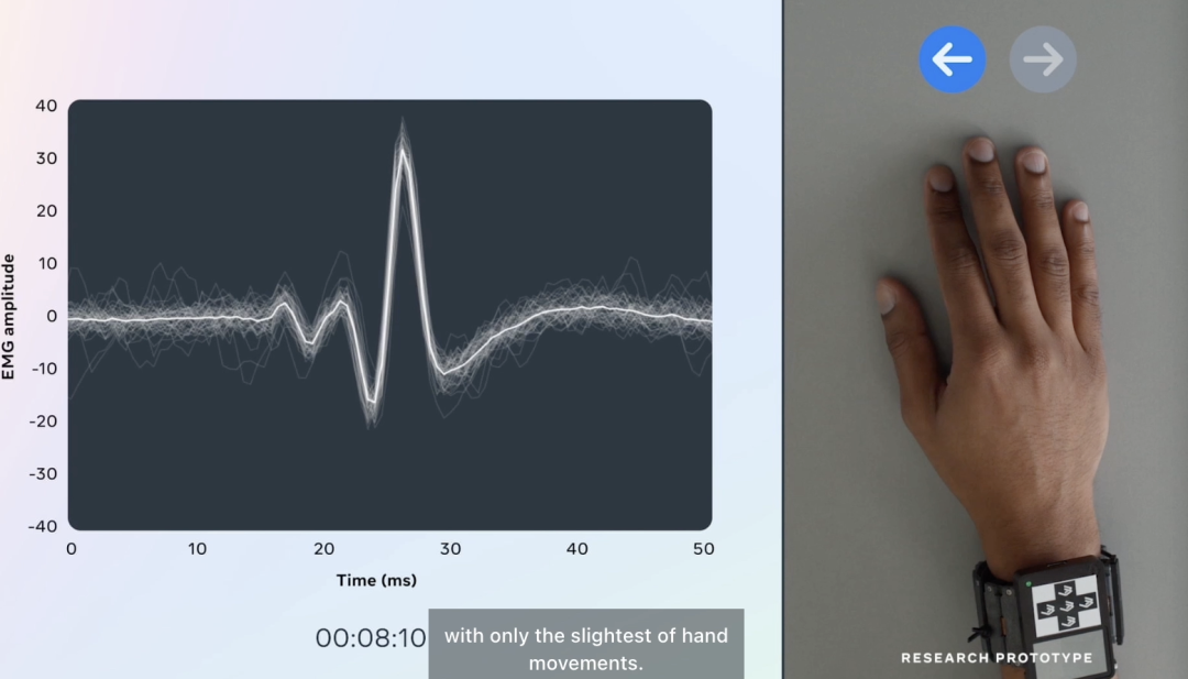 最后,扎克伯格還簡要介紹了一下正在研發(fā)的EMG腕帶原型。該設備可以通過輕微動作產(chǎn)生的肌電信號,完成交互操作?!拔覀冋J為,這是未來非常重要的一項技術?!痹瞬裾f道。