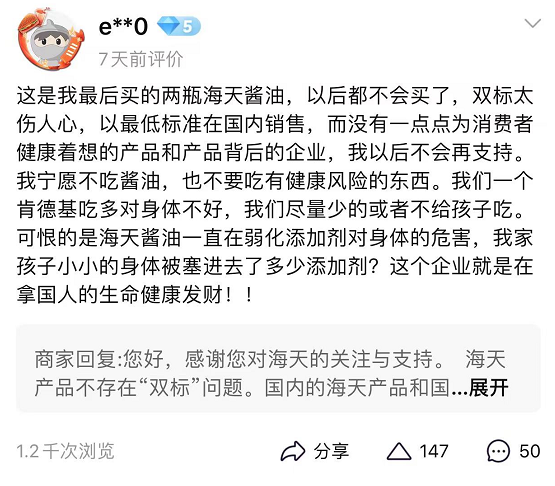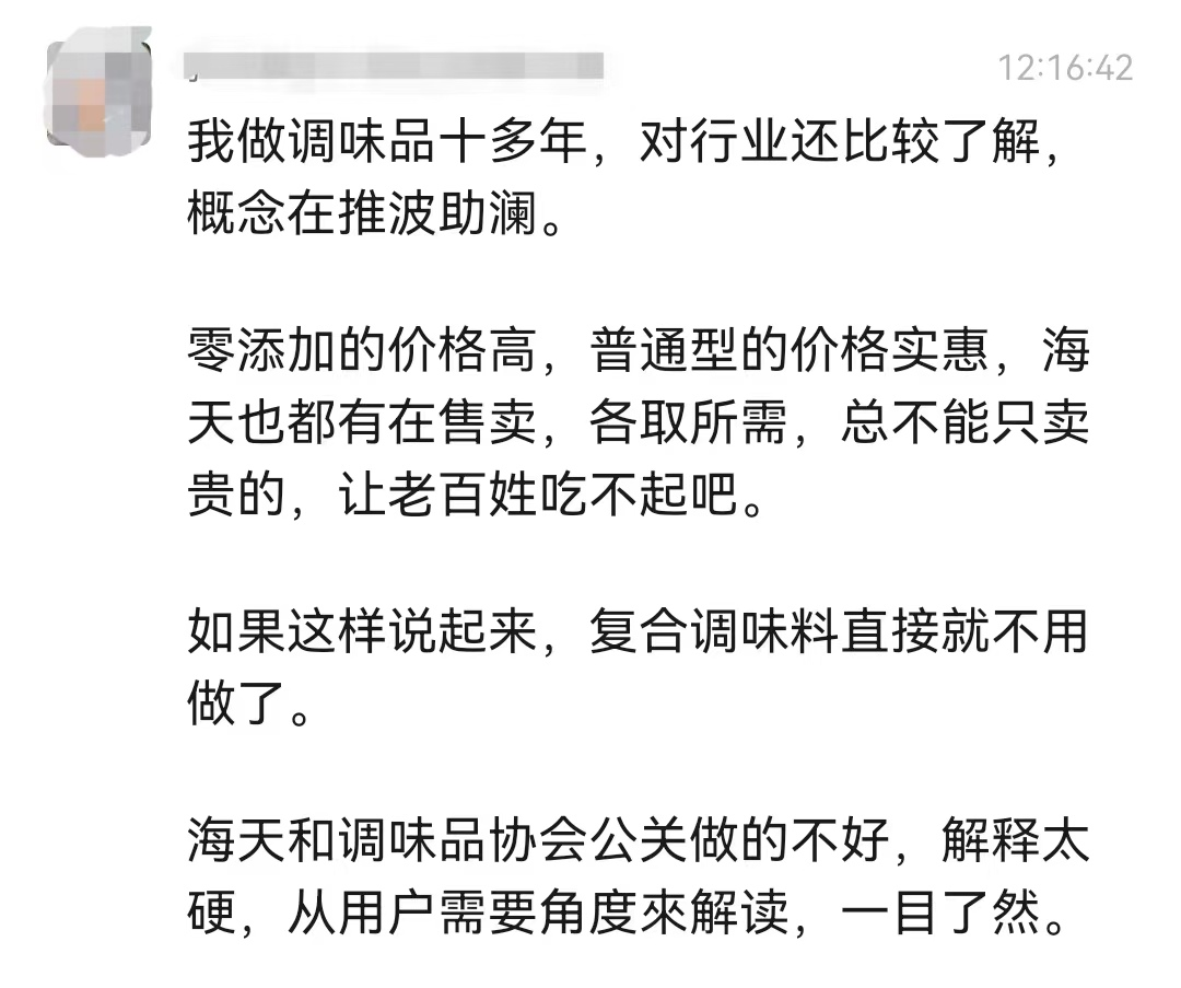 在我們采訪的行業(yè)人中,大多數(shù)都認(rèn)為海天事件不是一起食品安全事件,而是一個企業(yè)危機公關(guān)的失敗案例。大家不滿的地方在于,海天的公關(guān)是從“生產(chǎn)者”的視角出發(fā),并沒有代入消費者的視角。
