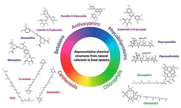 所謂的天然色素是通過天然資源獲得的食用色素,按來源不同可分為植物色素、動物色素、微生物色素三大類;若按色素按照化學結(jié)構(gòu)可分為多烯色素、酚類色素、吡咯色素、醌酮色素、其他類色素;按溶解性則能分為水溶性色素和脂溶性色素。