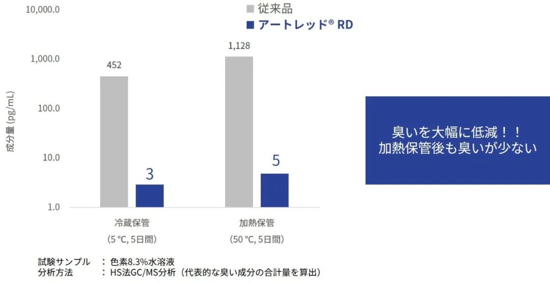 ARTRED RD使用San-Ei Gen的專利技術(shù),使得產(chǎn)品與傳統(tǒng)的紅蘿卜色素相比,“甲硫醇”、“二甲基二硫醚”、“二甲基三硫醚”的等異味成分的含量減少99%以上。