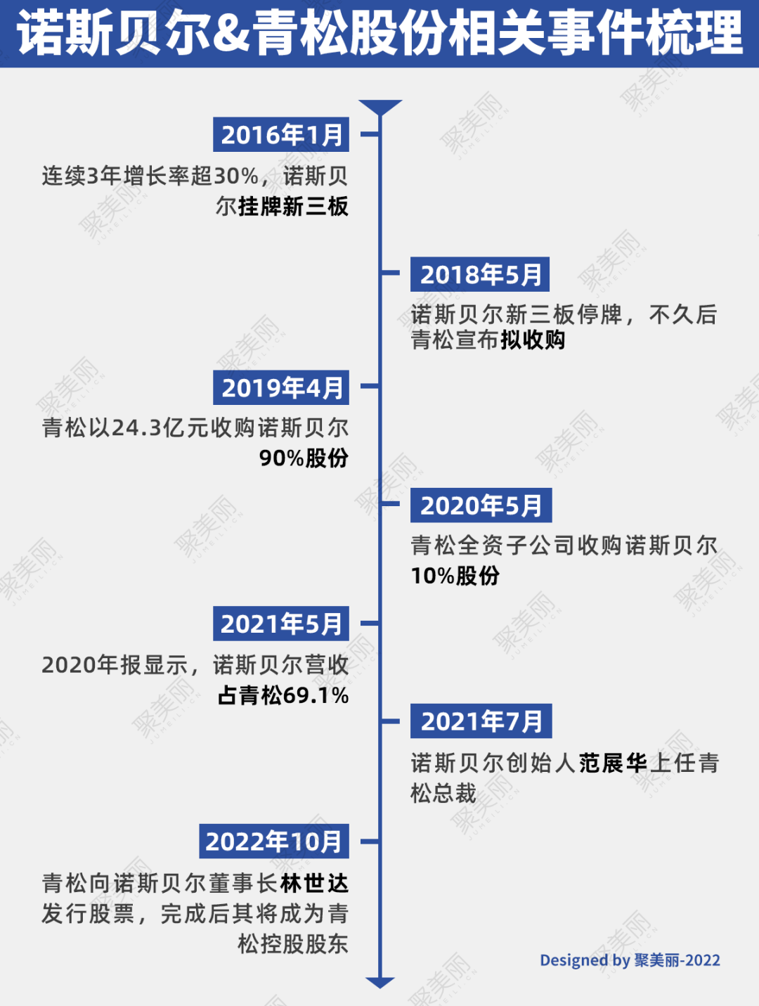 2019年4月,青松股份宣布收購諾斯貝爾90%股份,合計收購價24.3億元。2020年5月,青松股份發(fā)布公告,稱其全資子公司廣東領博收購香港諾斯貝爾持有的諾斯貝爾10%股份。最終,青松股份及其子公司以28.6億元的價格將諾斯貝爾完全控股。