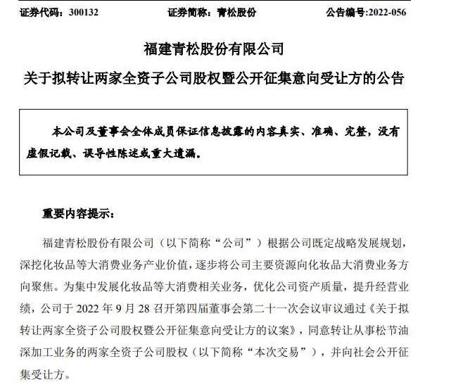 9月28日,青松股份發(fā)布公告,擬轉(zhuǎn)讓以松節(jié)油深加工業(yè)務為經(jīng)營主體的兩家全資子公司,如交易能順利完成,公司將剝離松節(jié)油深加工業(yè)務,聚焦于以化妝品業(yè)務為主業(yè)的大消費業(yè)務布局。此前,青松股份主要業(yè)務就是化妝品相關業(yè)務和松節(jié)油深加工這兩大板塊。