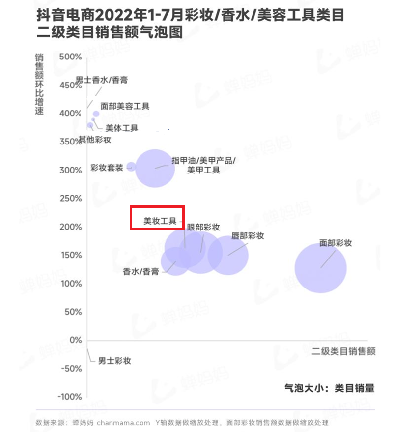 對于美妝工具市場情況,Wormhole蟲洞創(chuàng)始人Lila表示:“在抖音平臺上,今年美妝工具的增速非???,而且也開始有更多的細(xì)分,它的增長可能性與空間非常大?!睆亩兑羝脚_2022年1-7月彩妝/香水/美容工具類目的銷售額中可以看到,美妝工具的銷售額環(huán)比增速在150%左右,甚至高于眼部/唇部/面部彩妝。