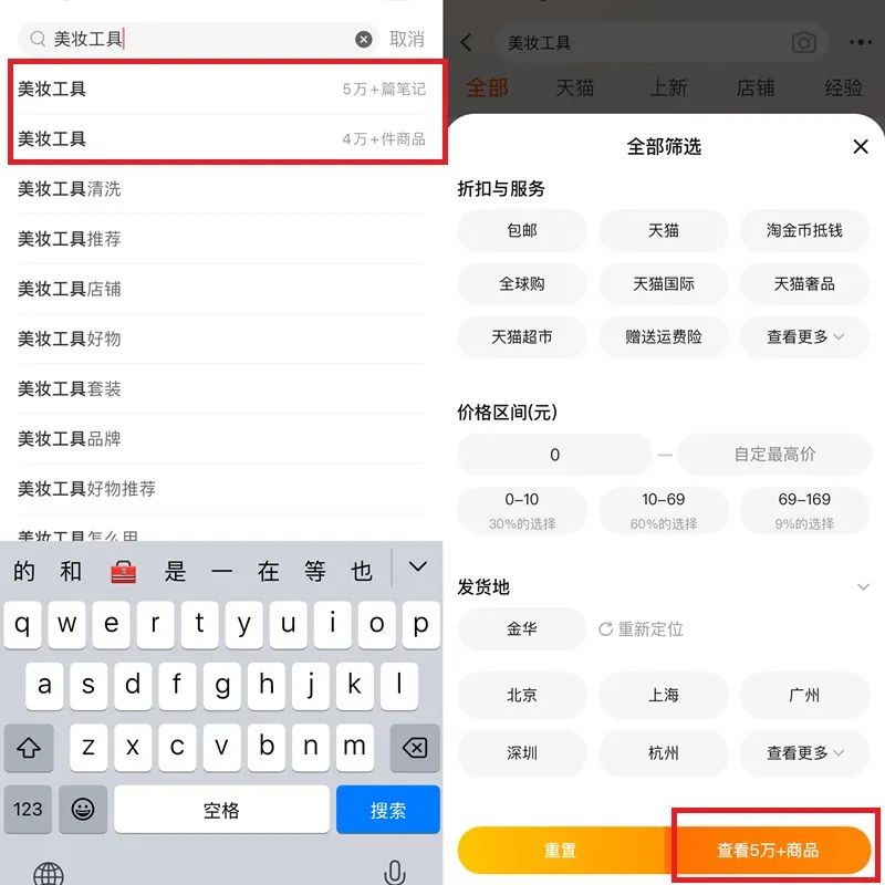 除了抖音平臺,小紅書APP上顯示,與美妝工具相關(guān)的筆記有5萬+篇,相關(guān)商品也有4萬+件在售賣。另外,在淘寶APP上,相關(guān)產(chǎn)品也為5萬+,90%的消費(fèi)者選擇69元以下的產(chǎn)品。由此可見,美妝工具的市場增速較快,但從整體上看,還處于初級發(fā)展階段。