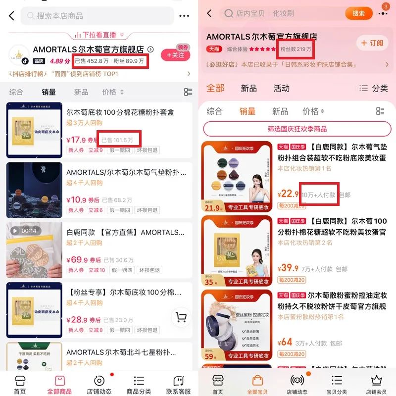 據(jù)了解,AMORTALS爾木萄抖音官方旗艦店的粉絲數(shù)為89.9萬,總銷量為452.8萬;天貓旗艦店粉絲數(shù)已達(dá)219萬,銷量TOP1的產(chǎn)品為北斗七星系列·雙面化妝粉撲,月銷達(dá)10萬+。
