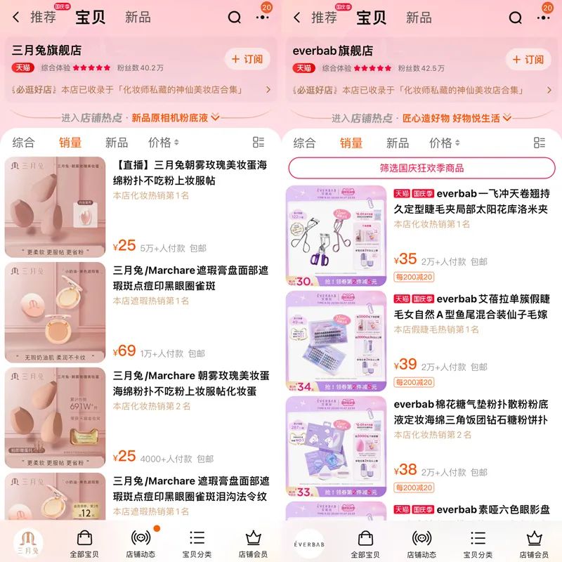 目前,三月兔天貓旗艦店的粉絲數(shù)為40.2萬,銷量TOP1是朝霧玫瑰美妝蛋,月銷達(dá)5萬+;everbab天貓旗艦店的粉絲數(shù)為42.5萬,銷量TOP1是定型睫毛夾、單簇假睫毛和棉花糖氣墊粉撲,三種產(chǎn)品的月銷均為2萬+。