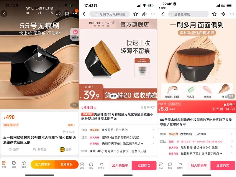 在淘寶APP上搜索,植村秀產(chǎn)品的官方售價為490元/個,而與其幾乎如出一轍的美麗味道55號粉底刷為39.9元/個,購買第二件只需要20元。除了美麗味道品牌外,抖音平臺售賣相似粉底刷的店鋪不少于10家,有的產(chǎn)品價格甚至只需要8.8元。