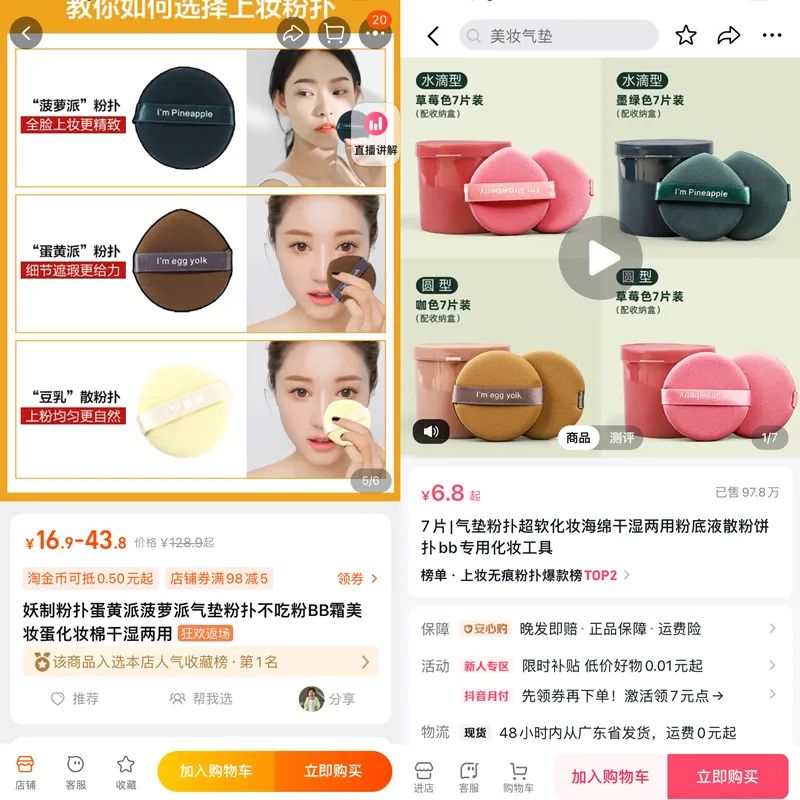 比如,在淘寶上名為妖制品牌的氣墊粉撲,目前售價為16.9元/3枚,月銷量為4萬+件,產(chǎn)品有豐富的形狀和顏色可以供消費(fèi)者選擇,而同時在抖音平臺,與其外觀設(shè)計相似的“圣卡琳美妝專營店”的非品牌氣墊粉撲售價為18.9元/14枚,銷量達(dá)95.9萬件。他們的售價都不高,但銷售量差異較大。