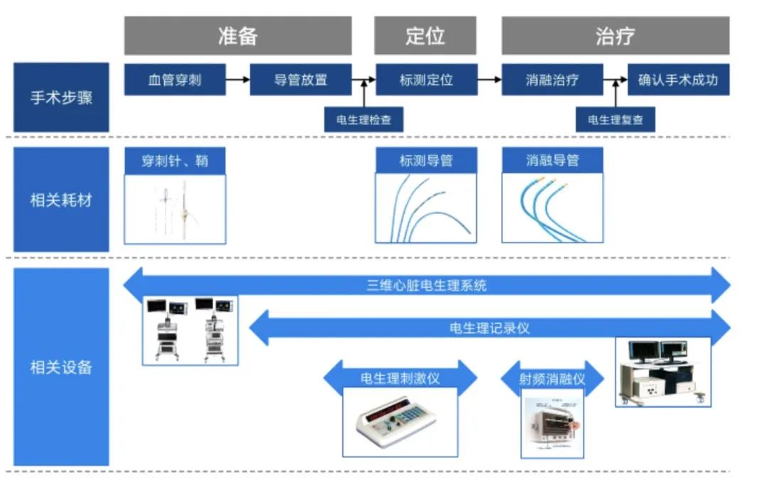 電生理手術(shù)非常復(fù)雜,簡單來說就是“標(biāo)測+消融”兩大環(huán)節(jié)——先找到病變位置,然后對其進(jìn)行消融處理,不同階段要用到不同的設(shè)備和耗材。