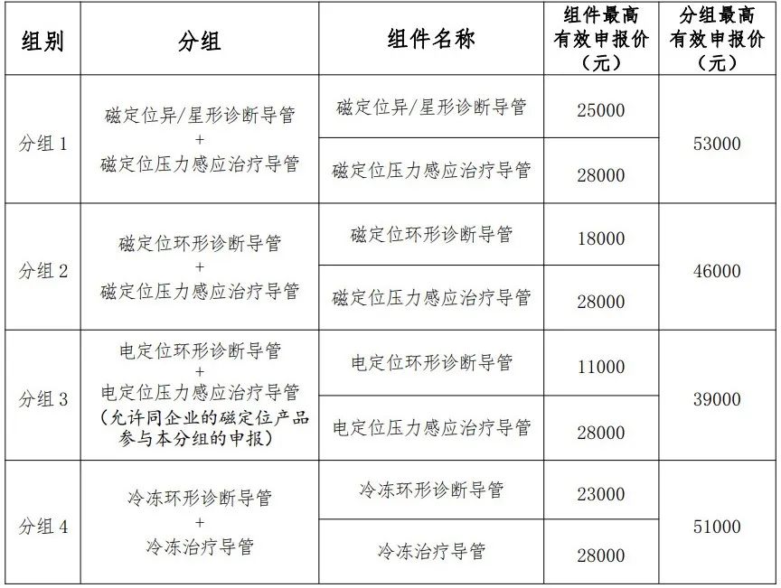 組套采購最高限價(jià)如下圖,其中單價(jià)最高的是分組1,磁定位異/星形診斷導(dǎo)管+磁定位壓力感應(yīng)治療導(dǎo)管,最高限價(jià)為53000元。