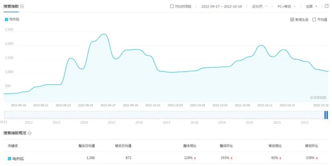 百度搜索指數(shù)顯示,從9月23日秋分節(jié)氣開始,取暖器和電熱毯的搜索數(shù)據(jù)漲幅顯著,如下圖所示,9月17日-10月16日,二者的搜索數(shù)據(jù)在同比和環(huán)比上均大幅增長,而這也與近一個月以來幾輪寒潮的影響有著密切關(guān)系。